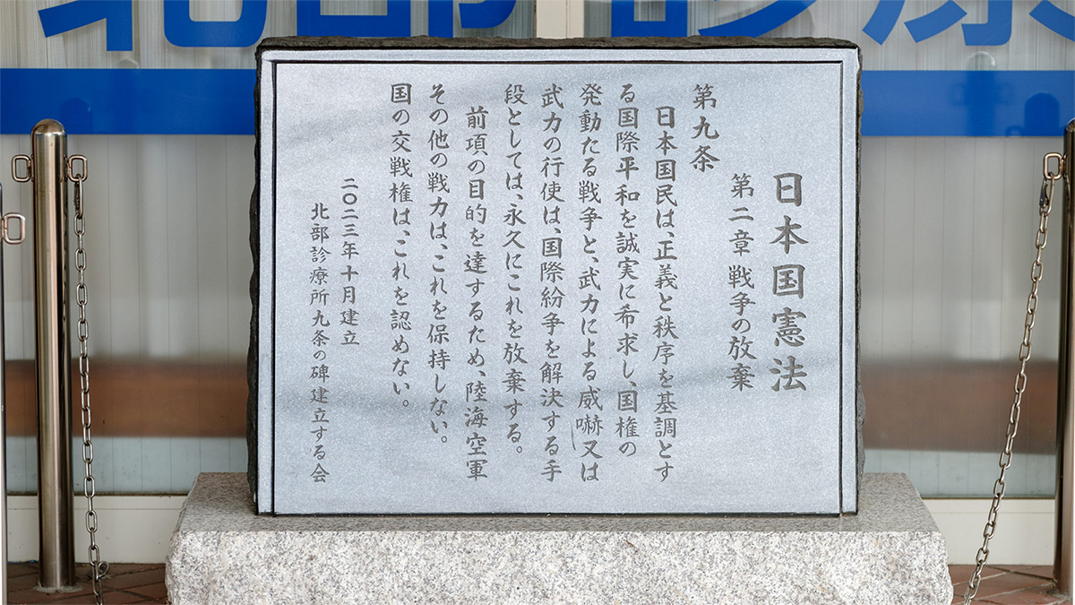 北部診療所の正面玄関には、憲法九条の碑があります。憲法を守る運動を発信したいという想いのもと、職員や地域の方々で「九条の碑建立する会」を発足し、2023年10月21日に除幕式を行いました。ウクライナやガザ地区で戦乱が起きる中、日本の九条の価値は世界でますます大きくなっています。