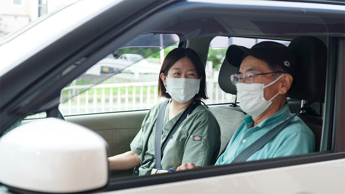 スタッフが軽自動車で送迎、民間タクシー、介護タクシー等での送迎も行っています。