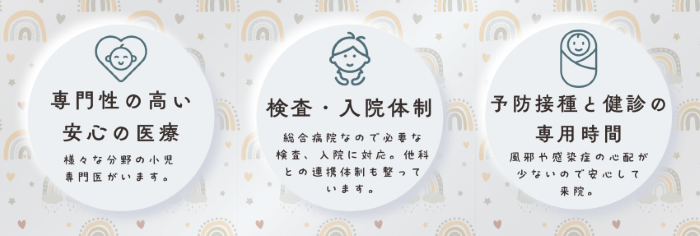 小児科診療体制は、午前中は予約制による一般診療、午後に予防接種、育児健診、 慢性疾患外来、退院後の初外来、発達障害(医師とともに臨床心理士が対応)などを開いています。 また、脳波、CT、MRI検査など精密検査にも対応できる体制です。