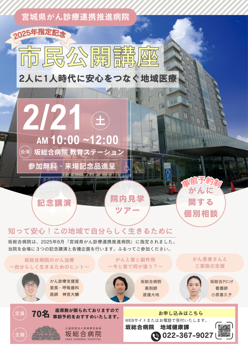 坂総合病院は、2025年8月「宮城県がん診療連携推進病院」に指定されました。当院を会場に3つの記念講演と各種企画を行います。ふるってご参加ください。